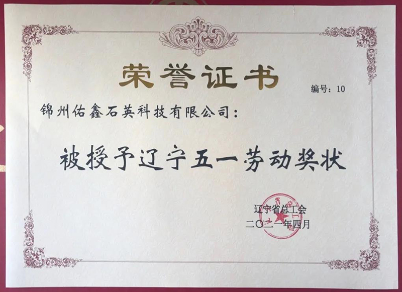 佑鑫石英被授予為"遼寧省五一勞動(dòng)獎(jiǎng)狀"獲得者,這份榮譽(yù)是對(duì)優(yōu)秀企業(yè)的最高褒獎(jiǎng)。勞動(dòng)最光榮,奮斗最美麗,榮譽(yù)來之不易,成績(jī)的背后,凝聚著佑鑫人的辛勤與汗水。